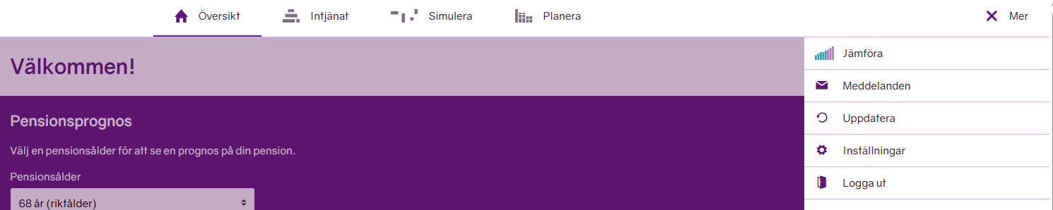 I förvalsprognosen räknar vi med att du fortsätter arbeta på ditt nuvarande arbete, med nuvarande lön, fram till riktåldern (beslutad eller beräknad beroende på födelseår) och att du sedan tar ut alla dina pensioner. Med en knapptryckning kan du ändra uttagsålder, tidigare eller senare, eller klicka dig vidare i verktygen för att till exempel välja olika uttagstidpunkter för allmän pension och tjänstepension.