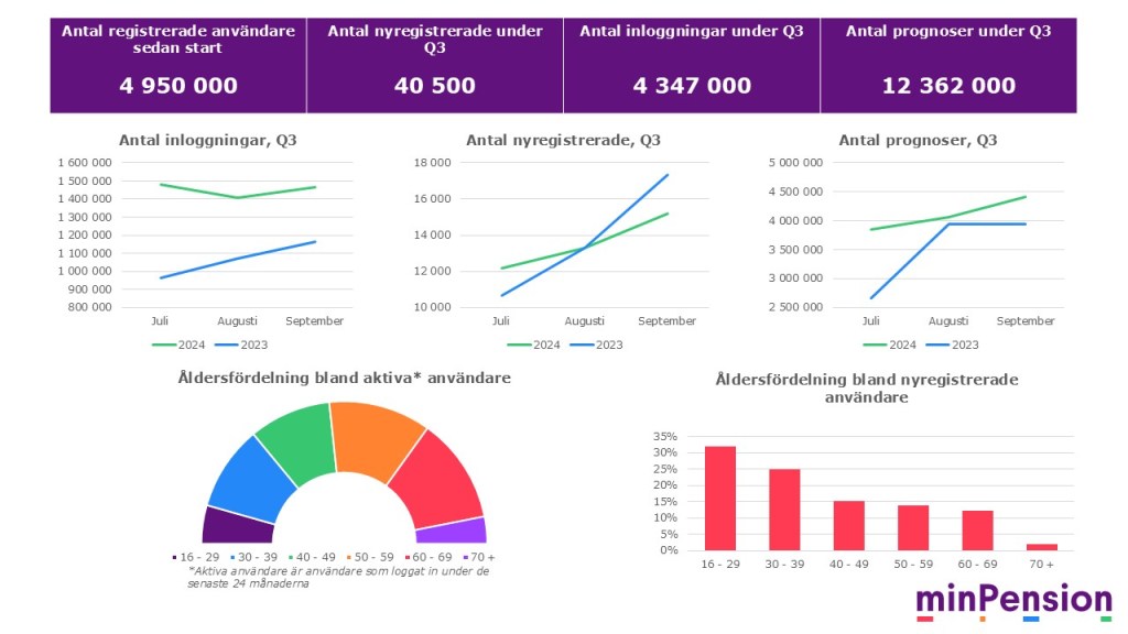 Vid kvartalets slut fanns det 4 950 000 registrerade användare på minPension, kvinnor utgör 48,6 % av dessa. Av våra registrerade användare har 3 610 000 loggat in under de senaste 24 månaderna.