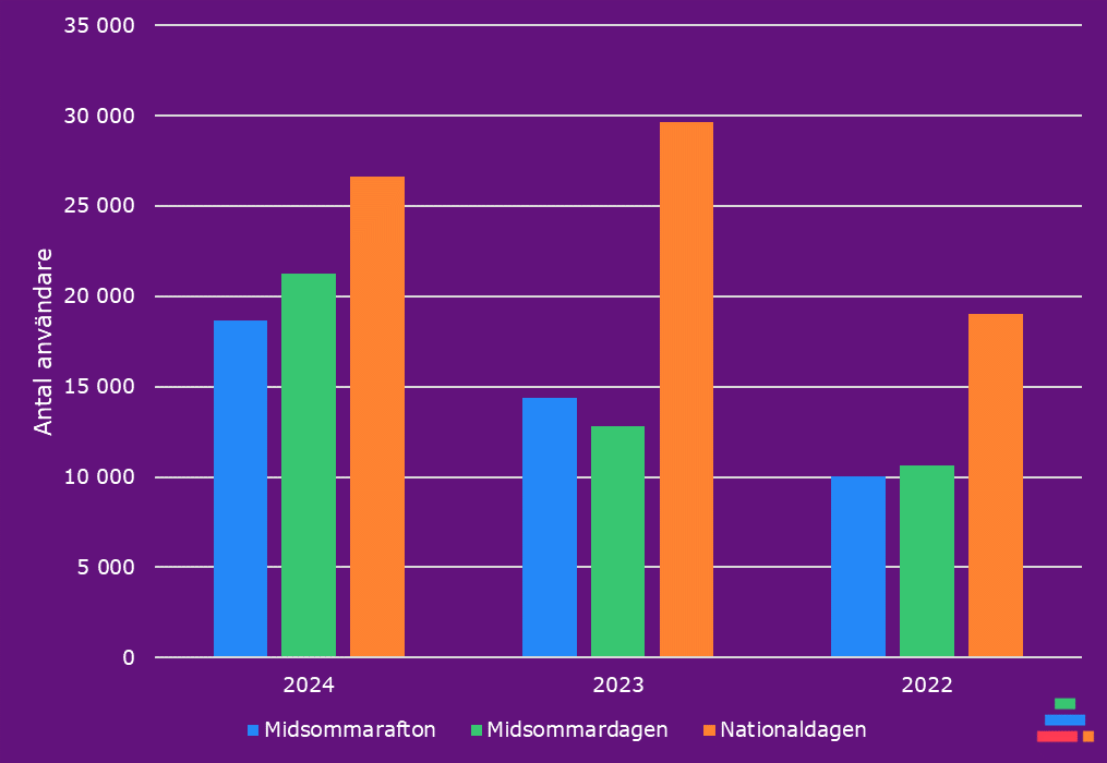 Vi började med att titta på hur många användare som har loggat in under respektive dag. Betydligt fler användare loggade in under midsommarhelgen 2024 jämfört med tidigare år. Under Nationaldagen var det istället något färre som loggade in jämfört med 2023.