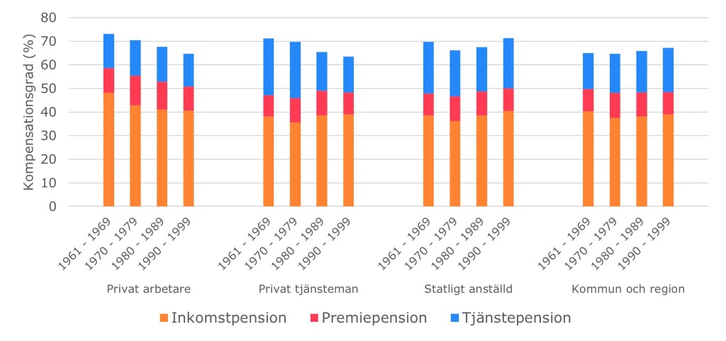 Det är stora skillnader mellan män och kvinnor med jämförbar utbildning. Bland de som är födda på 1960-talet har män med förgymnasial utbildning en pension som är cirka 5 400 kr högre varje månad livet ut, för de med gymnasial utbildning 5 100 kr och för de med forskarutbildning 8 000 kr. Störst är dock skillnaden för de med eftergymnasial utbildning, 10 400 kr mer i pension för män jämfört med kvinnor. För yngre generationer är skillnaderna mindre. Privatanställda arbetare och utrikes födda med eftergymnasial utbildning har lägre kompensationsgrader än andra med samma utbildningsnivå. Det tyder på att den ekonomiska utväxling man får på utbildning skiljer sig åt mellan olika grupper.
