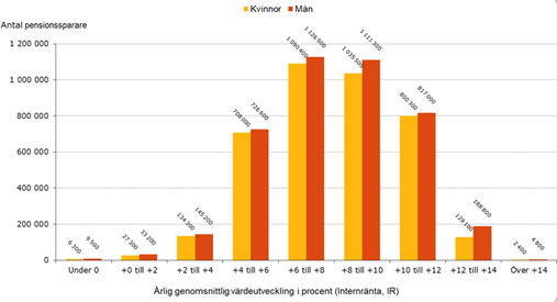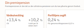 Det finns även en ruta som summerar alla år av insättningar till din framtida pension. Här finns också den totala värdeutvecklingen, både för inkomst-och premiepensionen.