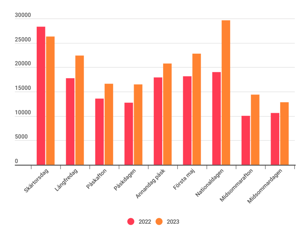 Skillnaden under midsommar jämfört med föregående år gjorde oss nyfikna att kolla hur det såg ut för några andra högtider och röda dagar som passerat. Vi sammanställde antalet användare som gjort minst en prognos under respektive dag för år 2022 och 2023.