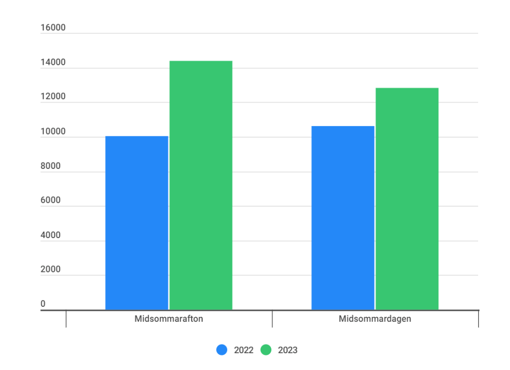 Efter midsommarhelgen var vi flera på minPension som var nyfikna på hur användandet av hemsidan hade sett ut under midsommarafton och -dagen. Vi undersökte antalet användare som hade gjort minst en prognos under dagarna och fann att jämfört med år 2022 hade vi fler användare under både midsommarafton och midsommardagen.