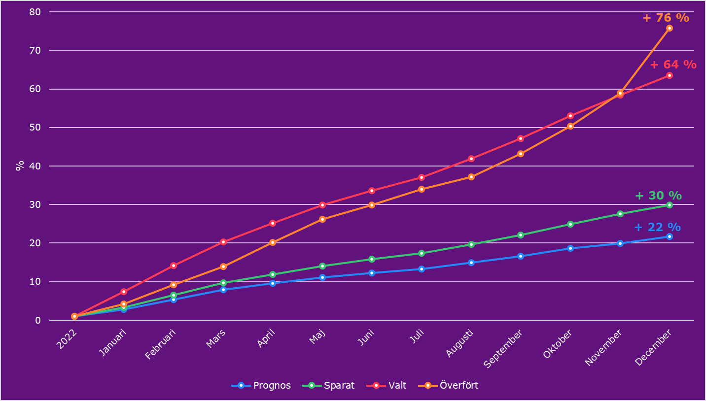 I alla fyra steg ser vi stora ökningar i antalet användare jämfört med antalen vid slutet av 2022. Antalet användare som har valt och överfört en plan har ökat med 64 respektive 76 procent. Antalet som har gjort en prognos med verktyget och som sparat en plan har ökat med 22 respektive 30 procent.