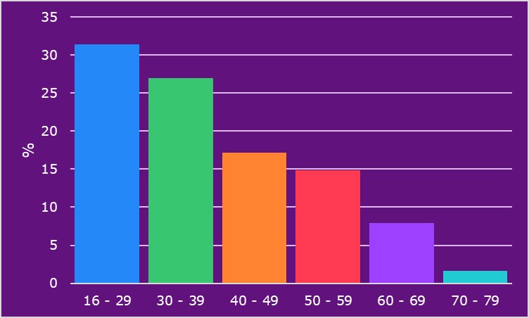 Man kan använda minPension från att man fyller 16 till och med att man fyller 80. När vi tittar på antalet användare per ålder, beräknat utifrån innevarande år och födelseåret, jämfört med Sveriges befolkning kan vi få en bild av vilken del av befolkningen som använder våra tjänster. På totalen ser vi att 60 procent av befolkningen mellan 16 och 80 har använt eller använder minPension. Vi är speciellt glada för att i användarna som är mellan 65 och 69 mer än 9 av 10 svenskar använt minPension.