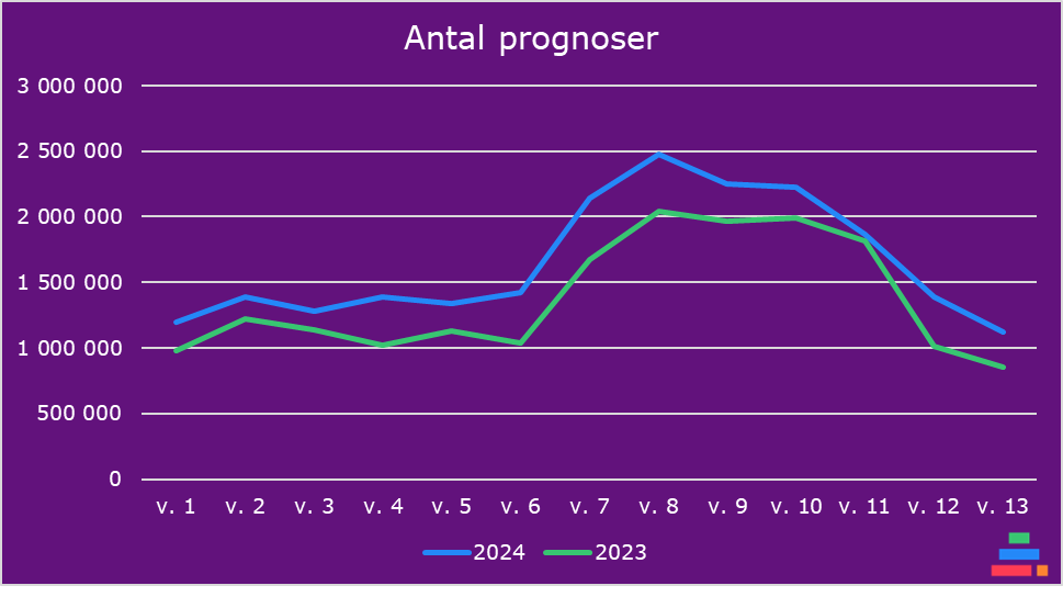 Under året har vi som mest inloggningar under det första kvartalet. Vi ser även en stor ökning i antal inloggningar under månaderna som vanligtvis har varit lugnare. Totalt har antalet inloggningar ökat med 11 procent under 2023 jämfört med 2022. Under året har det gjorts 48,7 miljoner prognoser vilket är en ökning jämfört med 2022 med 23 procent. Att antalet prognoser ökar mer än antalet inloggningar innebär att användare överlag gör fler prognoser per besök än tidigare.
