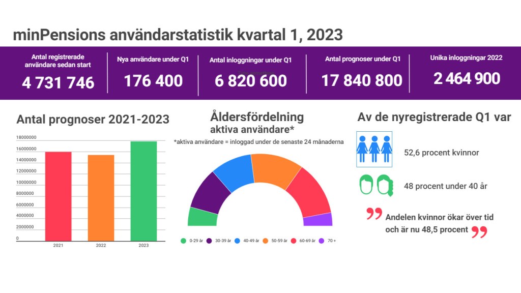 Under första kvartalet 2023 registrerade sig många nya användare på minPension. I mars tillkom hela 94 100 nya användare vilket var en ökning jämfört med mars år 2022. Nästan hälften av dessa är under 40 år och kvinnor fortsätter att utgöra en större andel av de nyregistrerade och andelen kvinnor ökar därmed över tid.