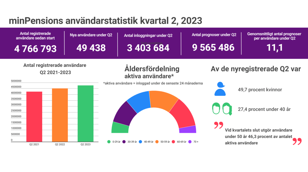 Halva 2023 har gått och det är dags att titta på användarstatistiken från andra kvartalet 2023. Under Q2 har nästan 50 000 nya användare registrerat sig på minPension. Mer än en fjärdedel av våra nya användare är under 30 år. Under kvartalet har över nio miljoner prognoser gjorts och i genomsnitt har varje användarna som gjort prognoser gjort 11,1 prognoser.