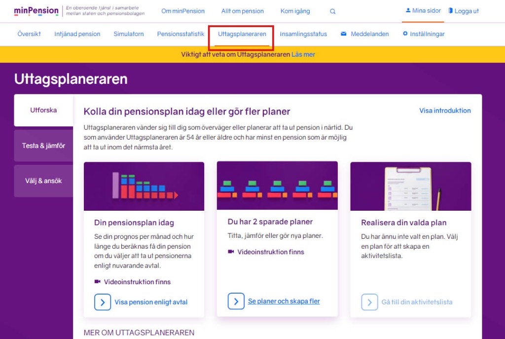 1. Att gå i pension före riktåldern innebär lägre pension – både för att du slutar tjäna in pension och för att utbetalningen sprids över fler år. Jämför olika alternativ på minPension.se – där ser du hur olika uttagsåldrar påverkar din pension. Allmän pension fortsätter du att tjäna in oavsett ålder. Vissa tjänstepensioner tjänar du in fram till 65 eller 66 år – andra har ingen bortre åldersgräns.